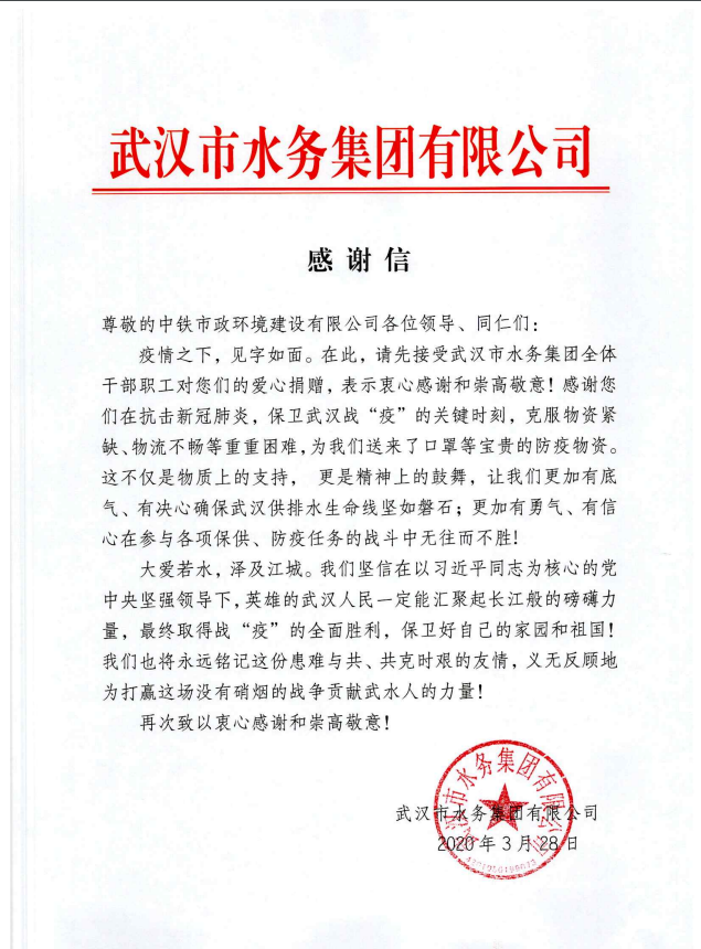 3月28日,公司(si)承(cheng)建的(de)武(wu)(wu)(wu)漢(han)(han)黃家湖污水處理廠三期擴建工程(cheng)在(zai)抗擊新(xin)冠肺炎(yan),保(bao)衛武(wu)(wu)(wu)漢(han)(han)戰“疫(yi)”的(de)關鍵時(shi)刻(ke),克服(fu)物(wu)資(zi)緊缺、物(wu)流不暢等困(kun)難,向武(wu)(wu)(wu)漢(han)(han)市水務集團有限公司(si)贈送(song)口罩(zhao)等防疫(yi)物(wu)資(zi),與(yu)他(ta)們患難與(yu)共(gong)、共(gong)克時(shi)艱(jian),做好疫(yi)情(qing)防控工作。為此,武(wu)(wu)(wu)漢(han)(han)市水務集團有限公司(si)特致電表示感謝。...