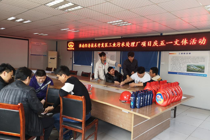 4月30日上午,淮南經濟技術開發區污水處理廠項目經理部組織開展了“慶五一”文體趣味活動。項目部在確保生產安全、隊伍維穩、施工有序推進的同時,組織安排了搶凳子、跳繩、摜蛋等文體活動。 (胡玉)