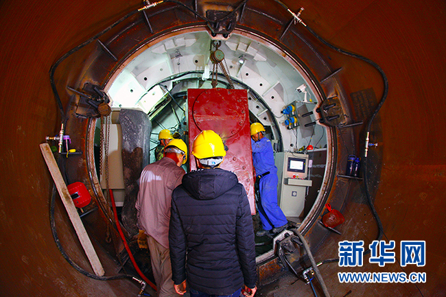 圖為施工人員在頂管管道頂端做準備工作。