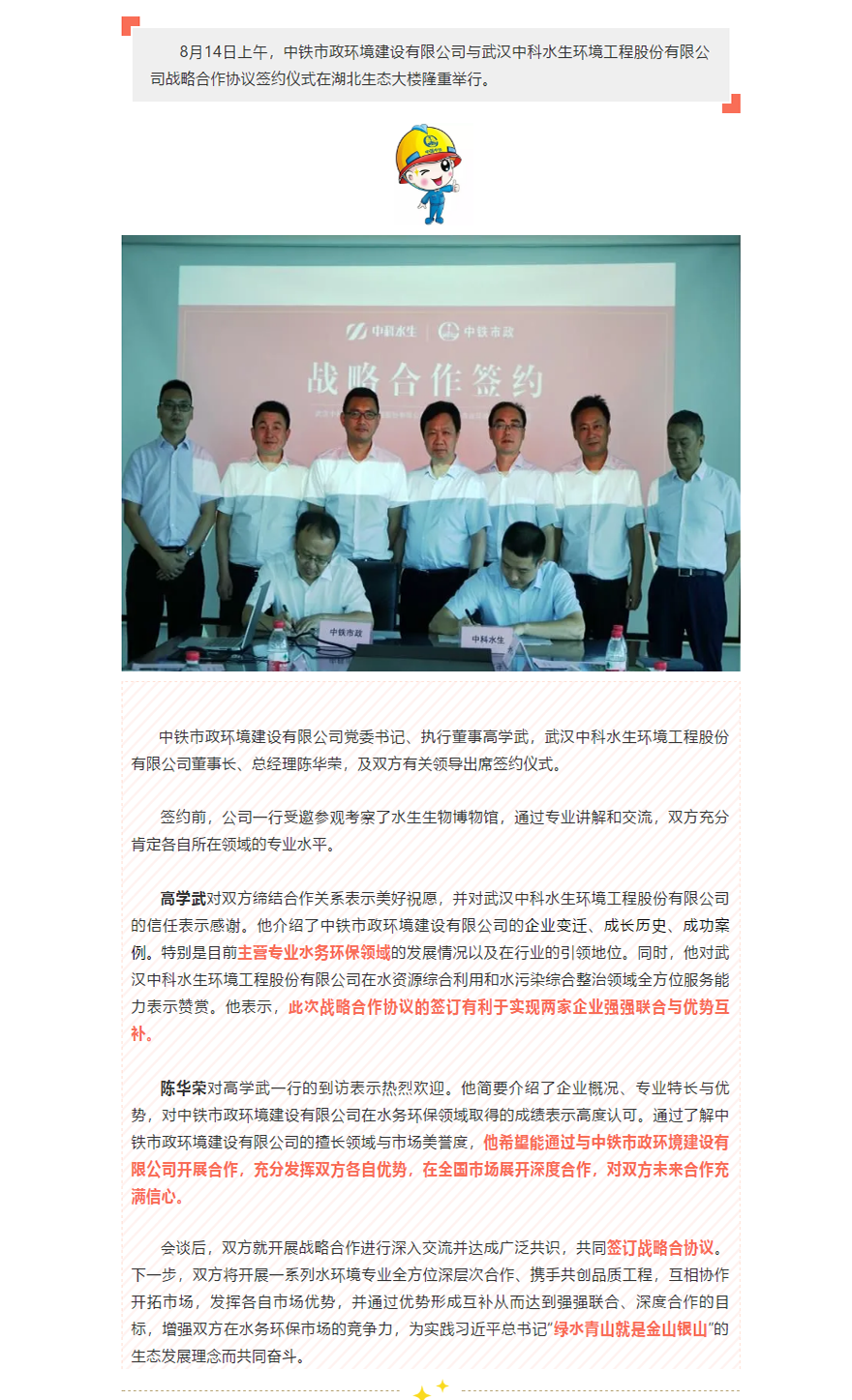 中鐵市政環境建設有限公司與中科水生簽署戰略合作協議