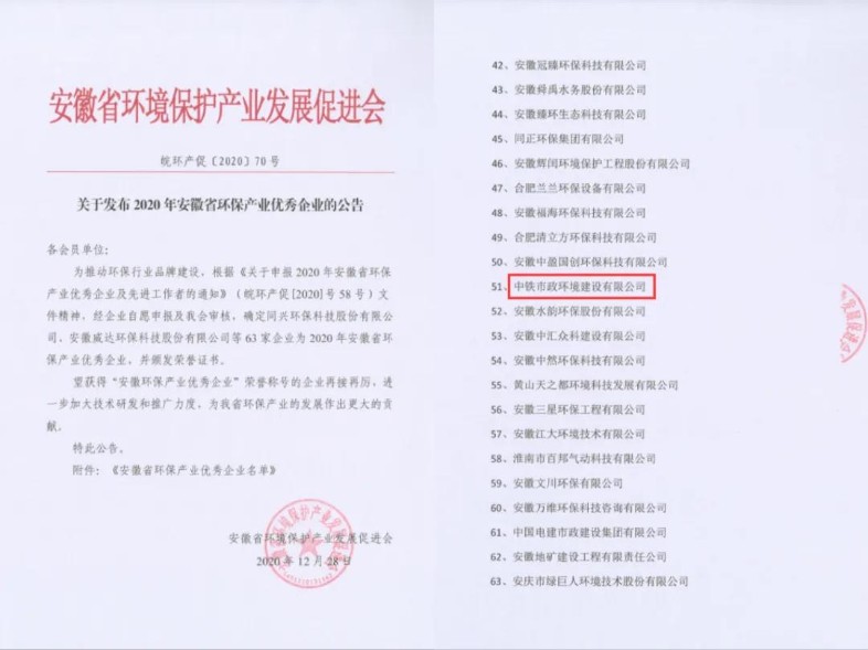 2020年(nian)12月,安(an)徽(hui)省(sheng)環(huan)境保(bao)護產業(ye)發(fa)展促(cu)進會發(fa)布“2020年(nian)安(an)徽(hui)省(sheng)環(huan)保(bao)產業(ye)優秀企業(ye)”公告(gao)、“2020年(nian)安(an)徽(hui)省(sheng)AAA級環(huan)保(bao)施工(gong)(gong)示范工(gong)(gong)地”通知及“2020年(nian)安(an)徽(hui)省(sheng)環(huan)保(bao)產業(ye)優秀企業(ye)及先進工(gong)(gong)作者”的(de)公告(gao)。