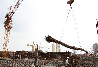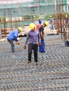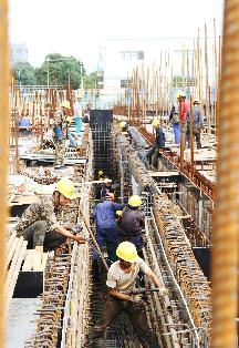 2015年9月25日拍攝,在昆山北區污水廠三期擴建工程施工現場工人們正在作業。 |